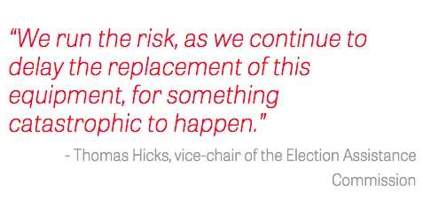 “If I had a computer that was that old, I would be really concerned about it,” said Thomas Hicks, vice-chair of the Election Assistance Commission. “That equipment is at the end of its lifecycle and it needs to be replaced,” but the federal government is unlikely to provide funding to the states. “There’s a crisis in funding it, because there’s no money available, and there’s a crisis in replacing it, because it’s so old and antiquated.”